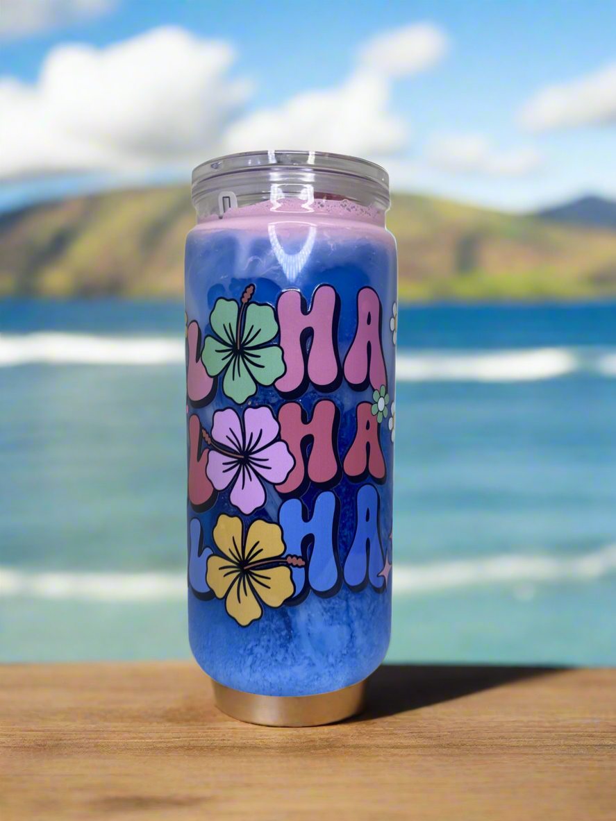 20 oz Acrylic Snow Globe. Dual Drip with light pink and dark blue solution. Features a Hawaiian themed UV FTF decal that says “Aloha”.