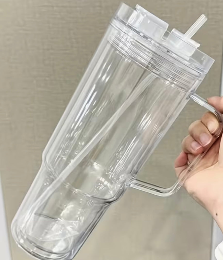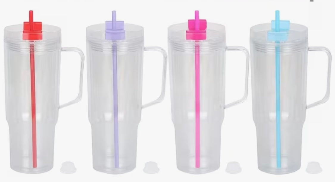 40 ounce, acrylic, Stanley, styled, snow globe with handle. A decal of your choice is included with the purchase of this tumbler. Each cup comes with a lid and a straw.