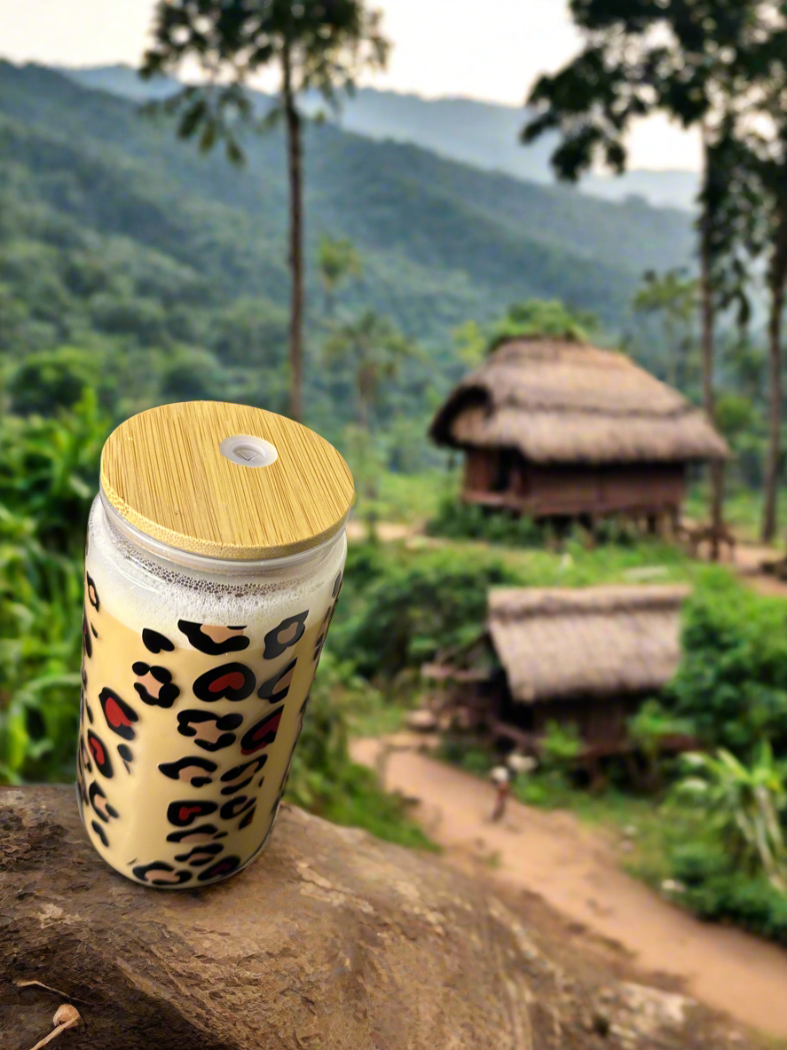 20 ounce acrylic snow globe Tumblr containing Coffey look-alike solution and featuring a leopard print decal. Comes with a bamboo lid.