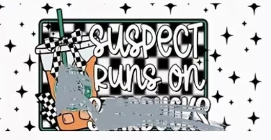 UVDTF decal that says suspect runs on and features a popular coffee company logo.