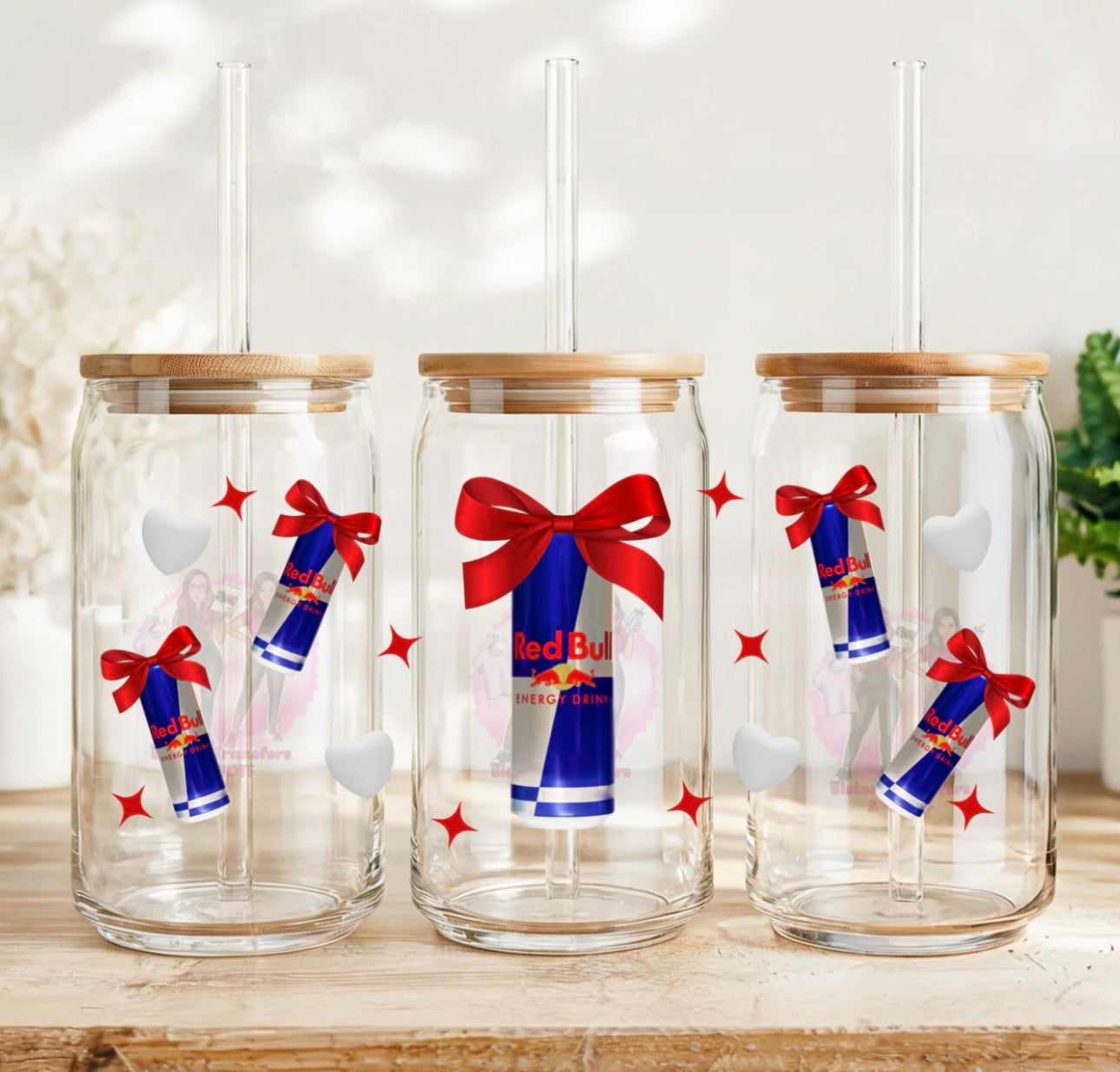 Add a bold and playful touch to your drinkware with our Energy Bow UVDTF Decal. This fun design features vibrant energy drink graphics paired with bright red bows and spark accents, creating a stylish and eye-catching look that’s perfect for anyone who loves their favorite pick-me-up beverage.