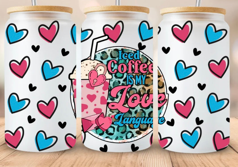 UVDTF decal picturing teal and pink hearts and says coffee is my love language.