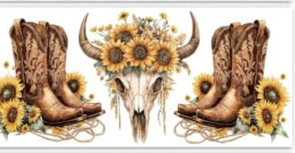UVDTF decal picturing a skull and cowboy boots with a floral arrangement.
