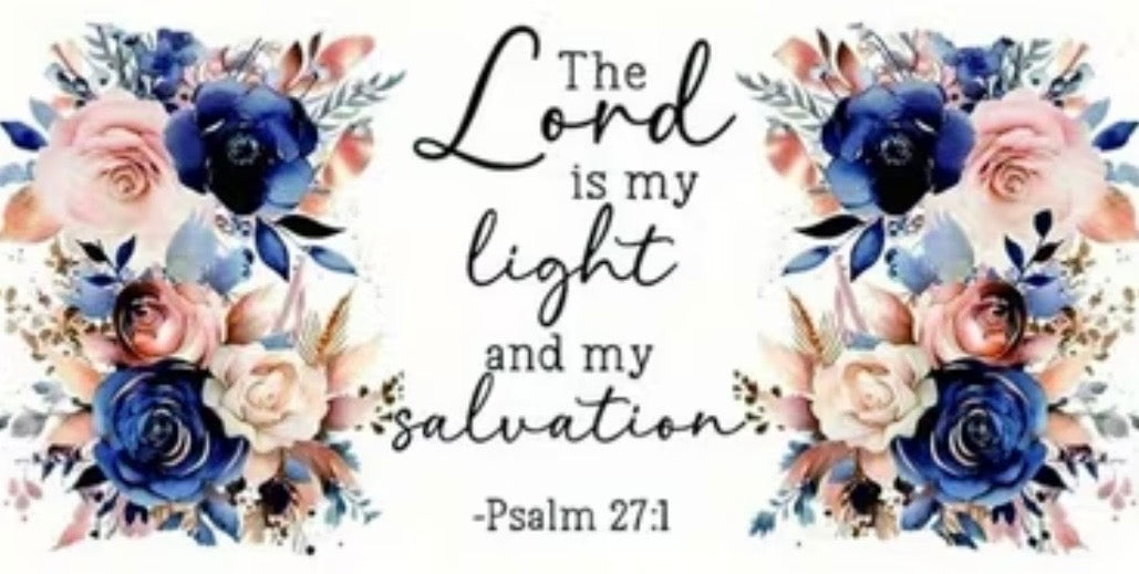 Soft florals meet bold faith in this eye-catching UVDTF decal, designed to make a statement with both color and meaning. Featuring a vibrant blend of deep blues, soft blush tones, and luminous accents, this design brings a fresh, slightly neon-inspired energy to a timeless scripture: “The Lord is my light and my salvation” – Psalm 27:1.