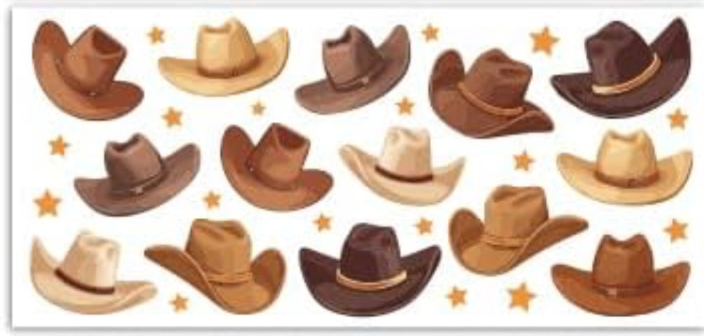 UVDTF decal, picturing animated, cowboy hats.