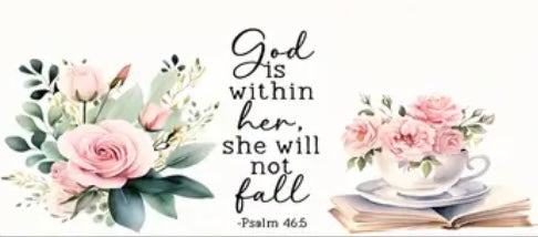 UVDTF decal featuring pink floral arrangements and says the scripture psalm chapter 46 verse five.