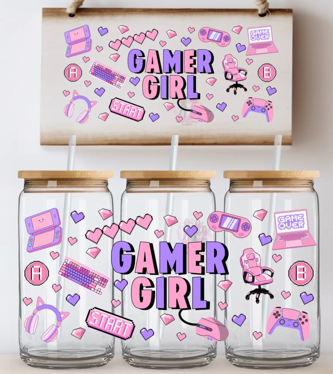 Level up your drinkware with our Gamer Girl UVDTF Decal. This fun and vibrant design features playful gaming elements like controllers, keyboards, headsets, and cute pixel-style hearts and icons, all centered around a bold “Gamer Girl” statement for the perfect gaming aesthetic.