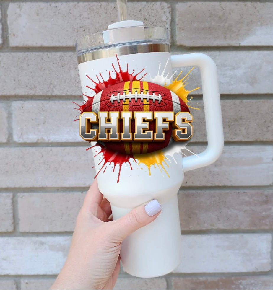 UVDTF Decal picturing the KS City Chiefs NFL team logo with a football and a splash of watercolor in team colors.