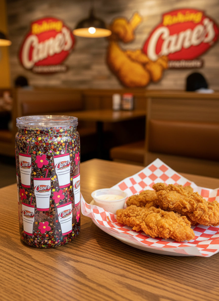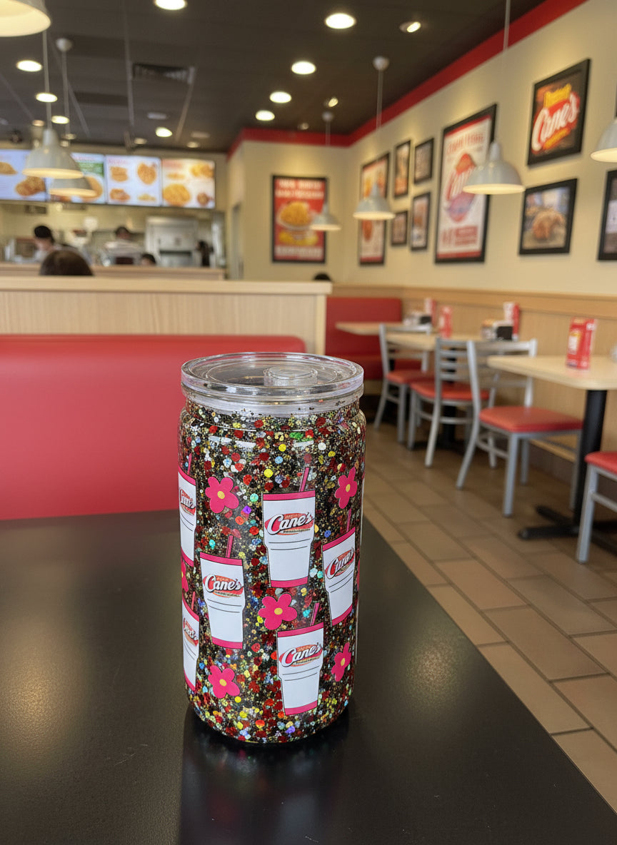 16 oz acrylic can styled snow globe containing Fast Flow solution with glitter colors, red, black, silver, and yellow. Features a Cane’s restaurant decal. Comes with a clear lid and straw.