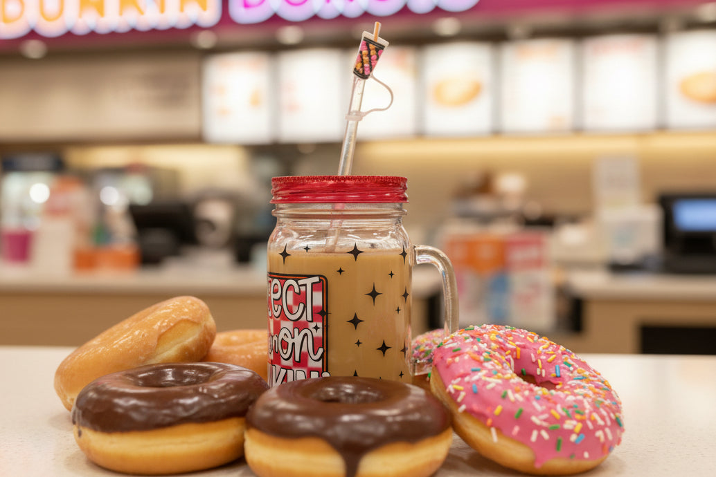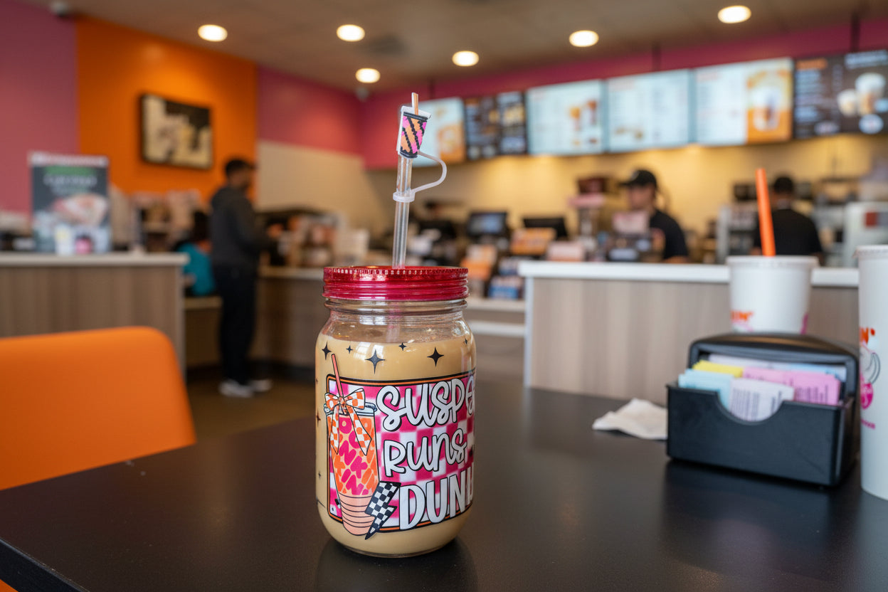 20 ounce, acrylic, mason jar, styled snow globe containing Coffee look-alike solution. This cup features a popular coffee shop decal and comes with a pink jelly lid to match. A straw is included as well as a matching straw topper.