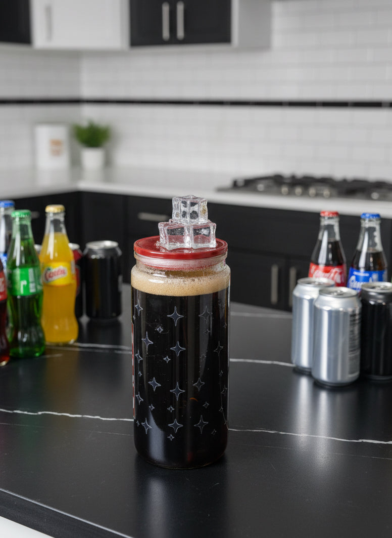 20 ounce, acrylic, canned styled, snow globe containing look-alike flow to mimic soda. This cup comes with a soda themed decal to match and a maroon jelly lid that has been customized with melting ice cubes. This Tumblr comes with a straw.