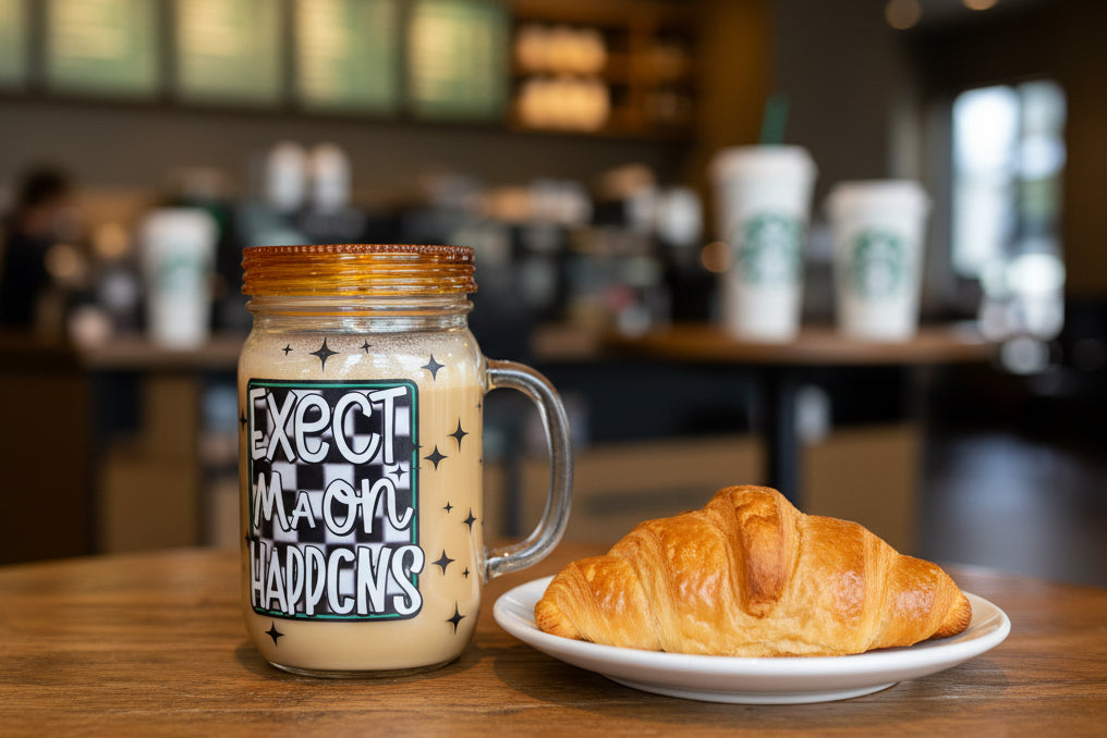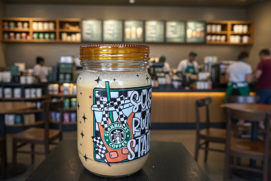 20 oz, acrylic, mason jar styled snow globe containing coffee look a like solution. Features a popular coffee, café decal and comes with a neon orange jelly lid that is spill proof and a straw to match.