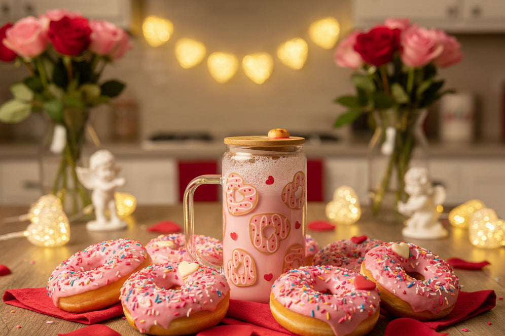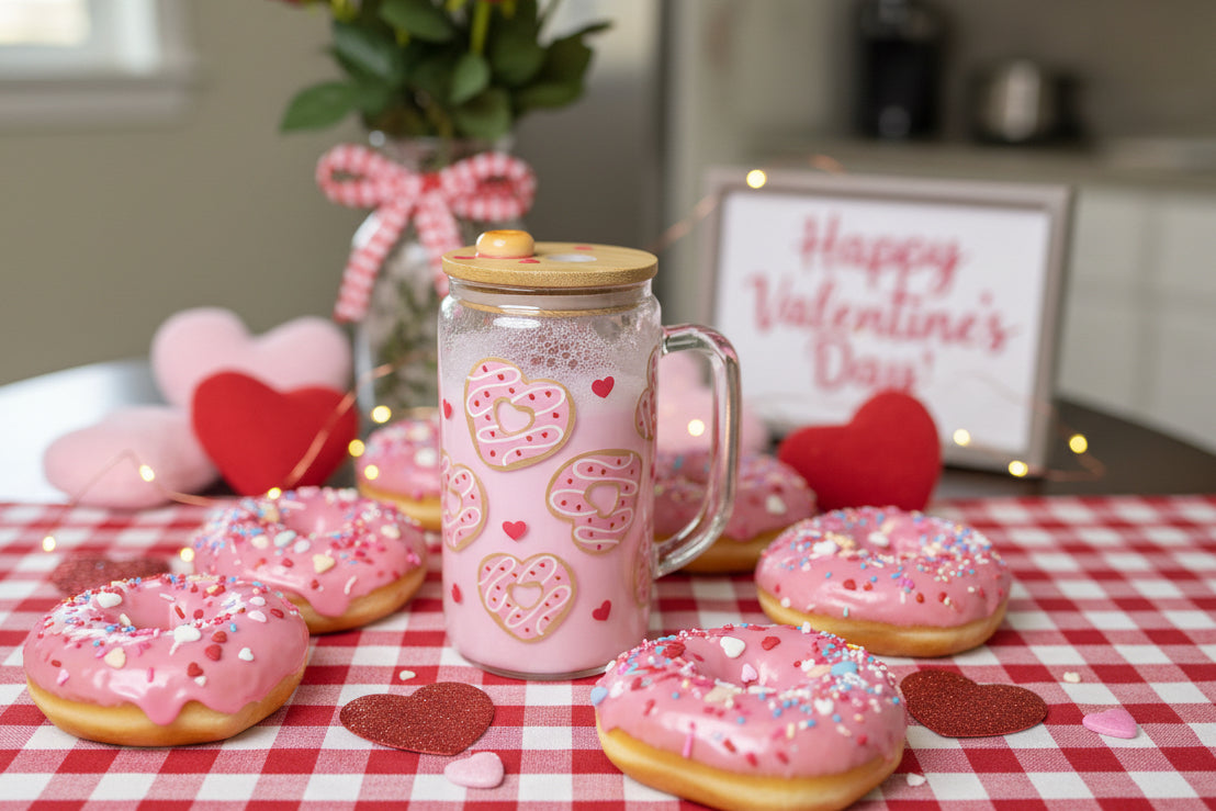 16 ounce, glass, mason jar, snow globe. This Cup contains strawberry milk, look alike solution and features a valentines doughnut themed decal. The bamboo lid is custom with decal hearts, and a doughnut charm. A straw is included.
