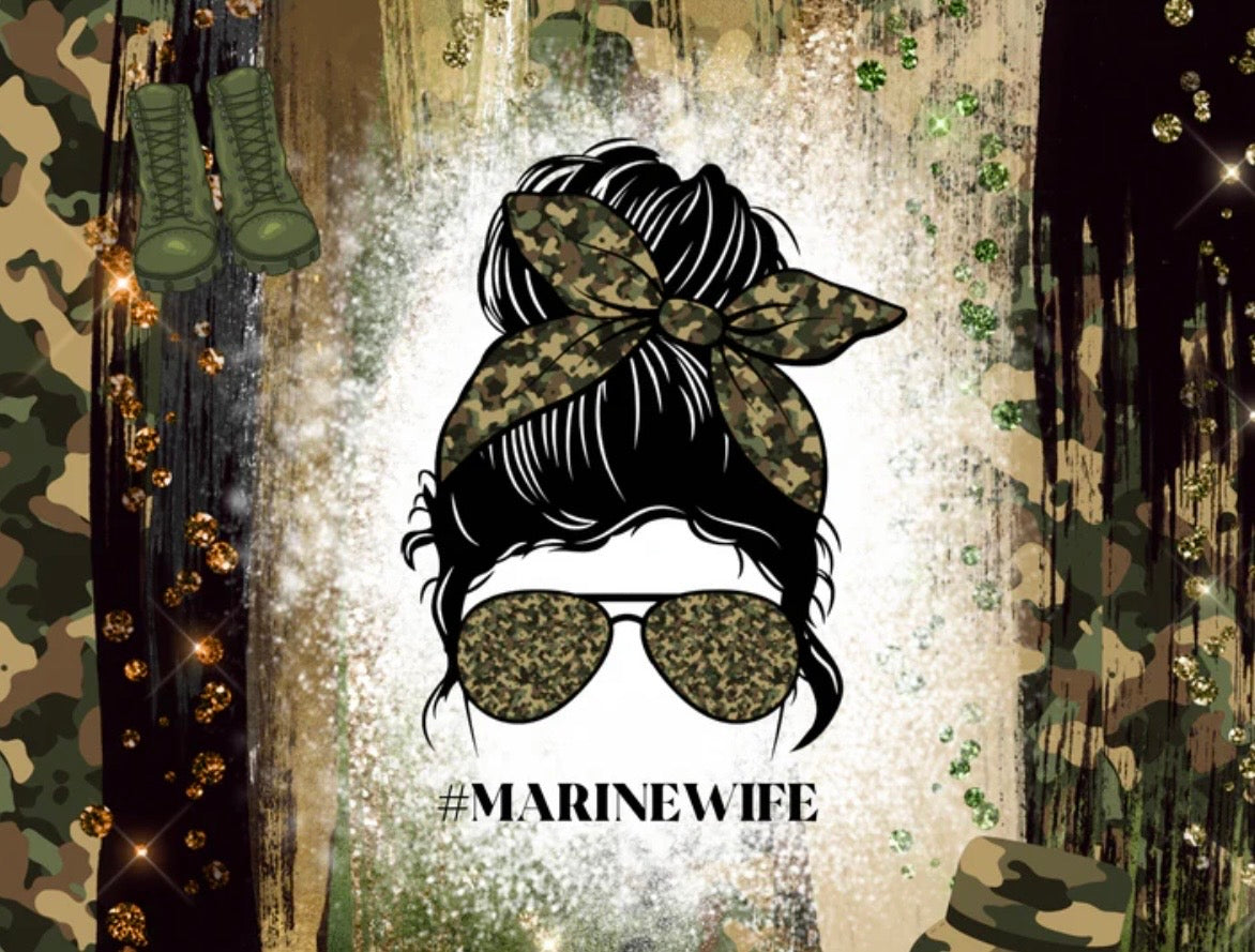 This camo beauty was made for the women who stand behind their Marines with pride. Featuring aviator shades, a messy bun wrapped in camouflage, and powerful #MarineWife energy, this design brings grit and glam together perfectly.