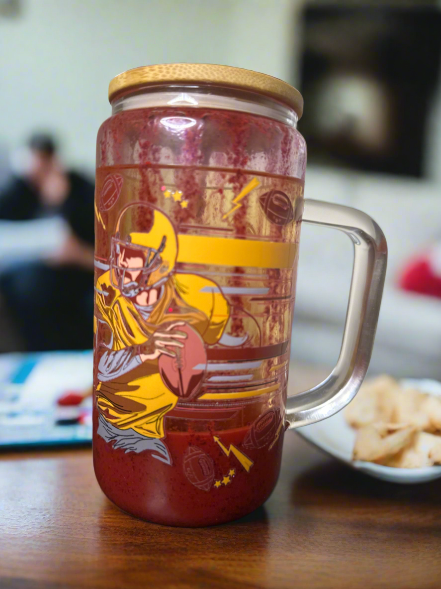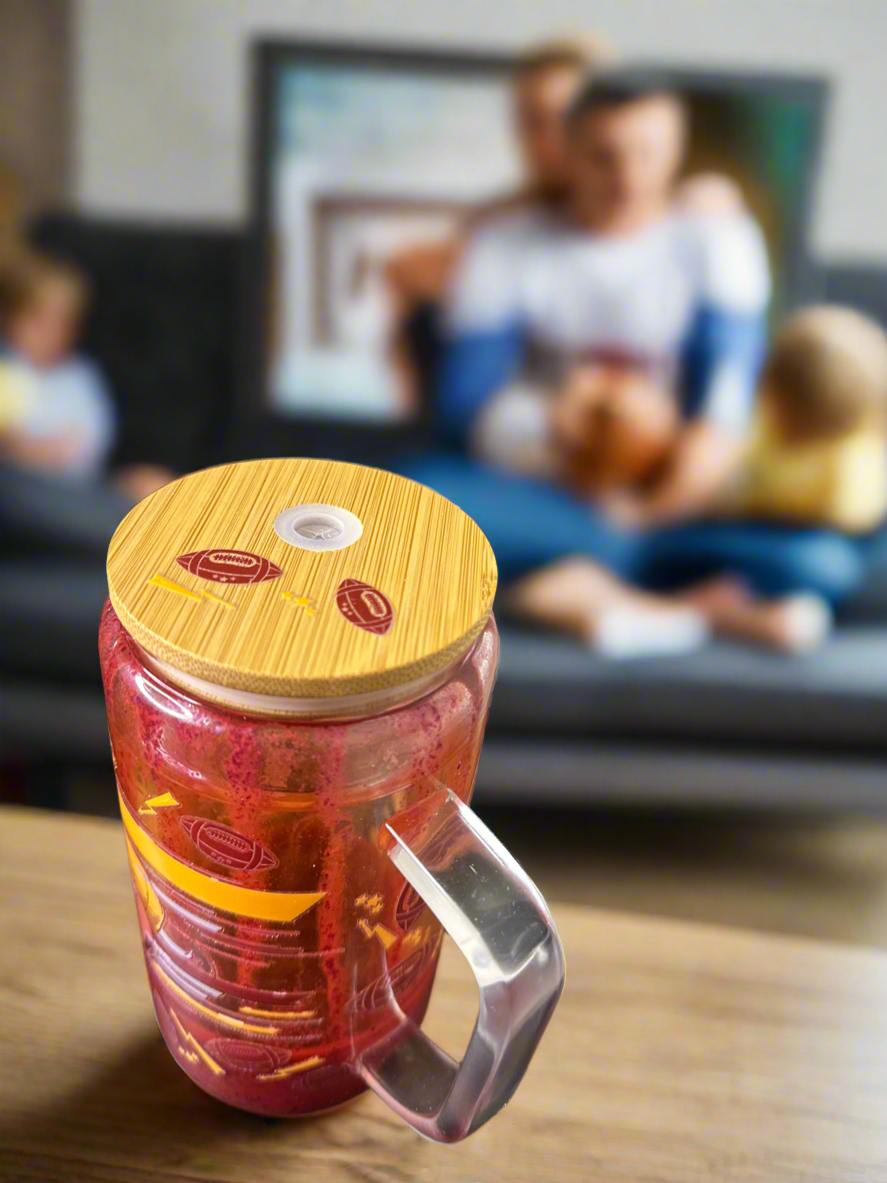 16 ounce glasses of snow globe Tumblr with handle containing dual drip flow with pigments of gold and maroon. The tumbler features a football themed and color gold maroon. The Tumblr comes with a custom bamboo lid and a clear straw.