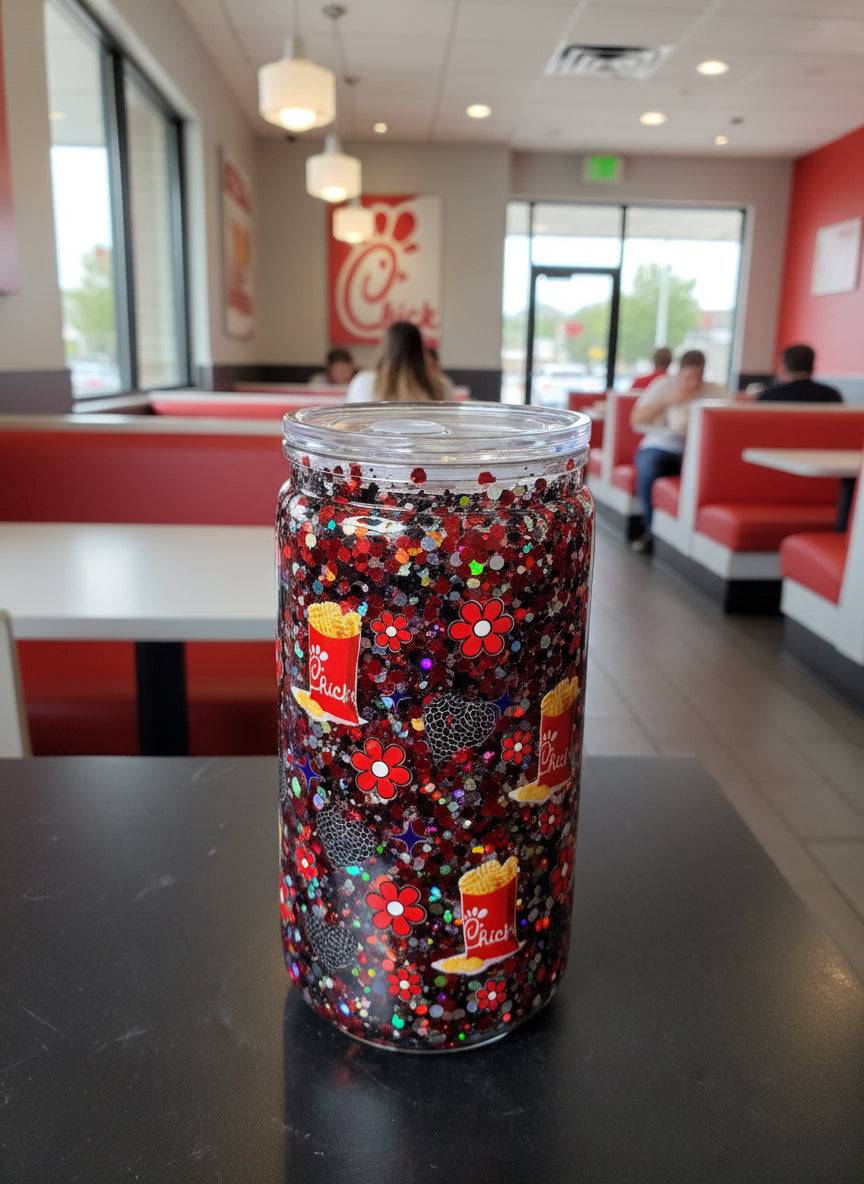 16 oz acrylic, can styled snow globe containing slow flow solution with glitter colors black, red, and silver. Comes with a clear lid and a straw.