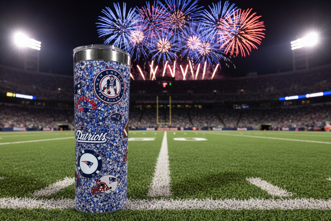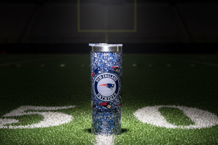 20 ounce, stainless steel, skinny styled, snow globe containing slow flow with glitter colors of silver, blue, and white. This cup comes with a spill proof suction lid that offers two drinking options and a stainless steel straw. This cup features an NFL Patriots themed decal.
