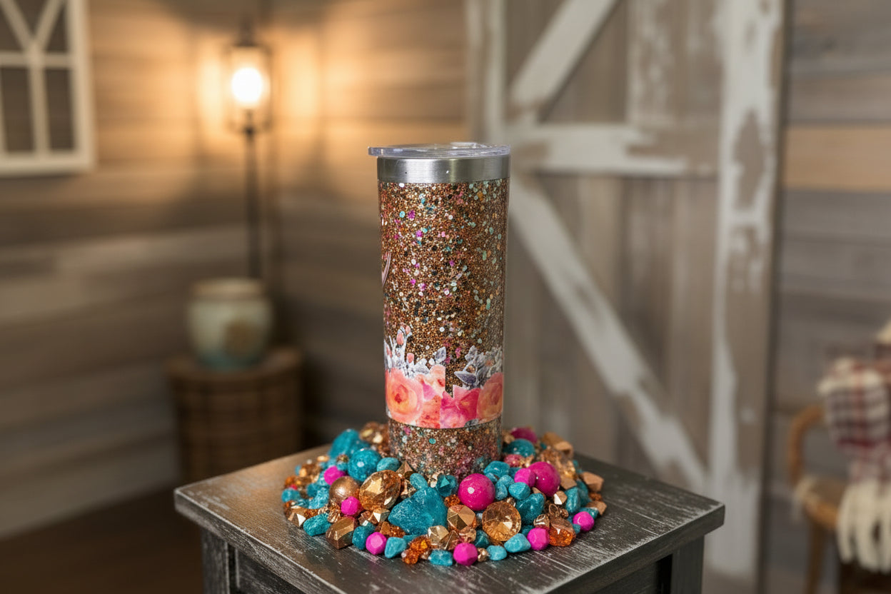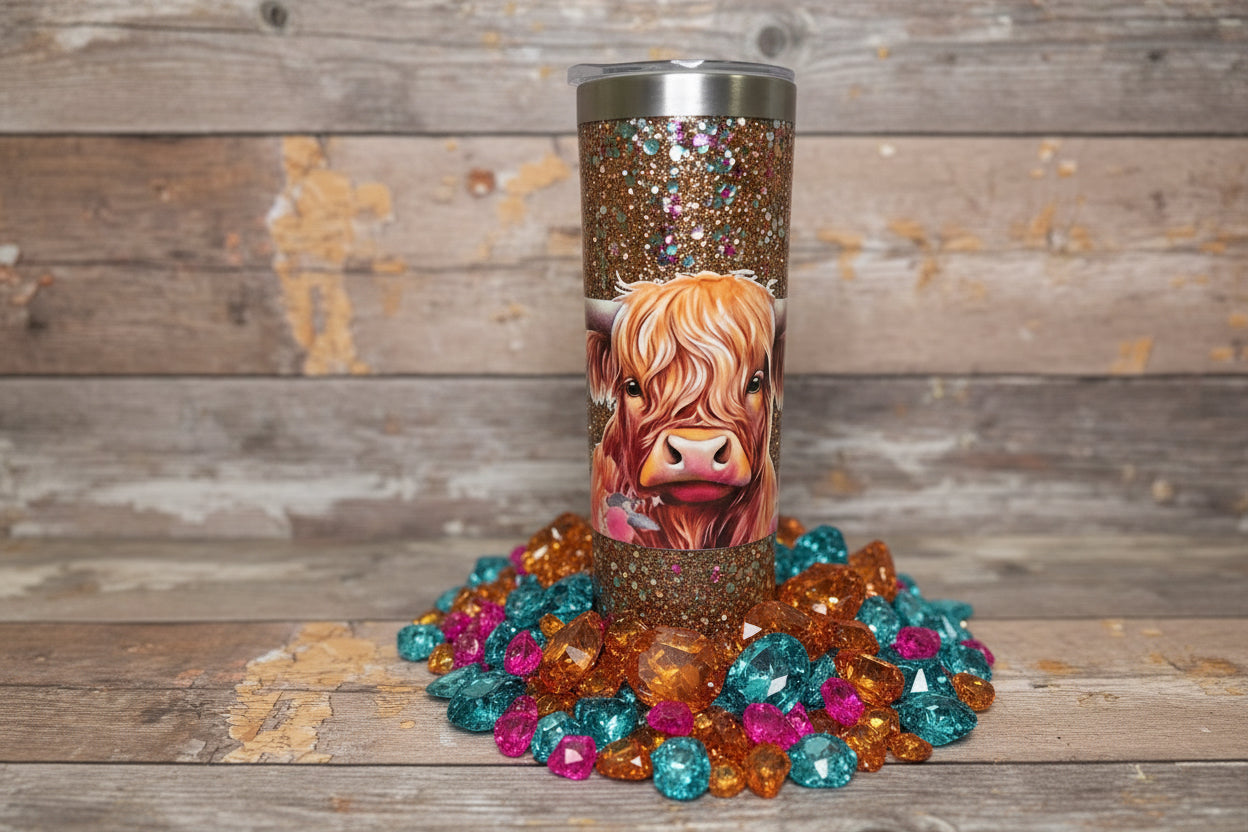 20 ounce, stainless steel, skinny style, snow globe containing slow flow with glitter colors of hot pink, teal, orange, peach, and copper. This cup features a highland cow themed decal and comes with a suction spill proof lid that offers two drinking options. A straw is included.
