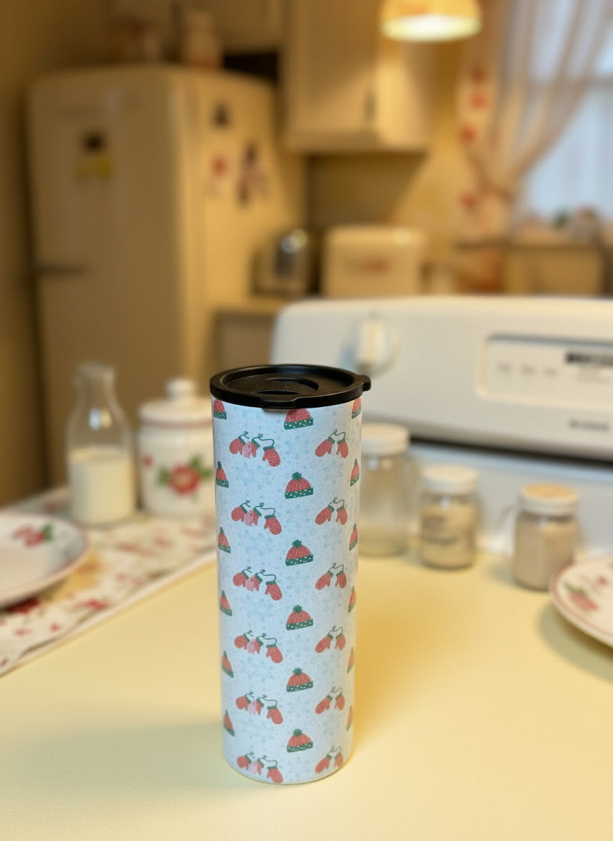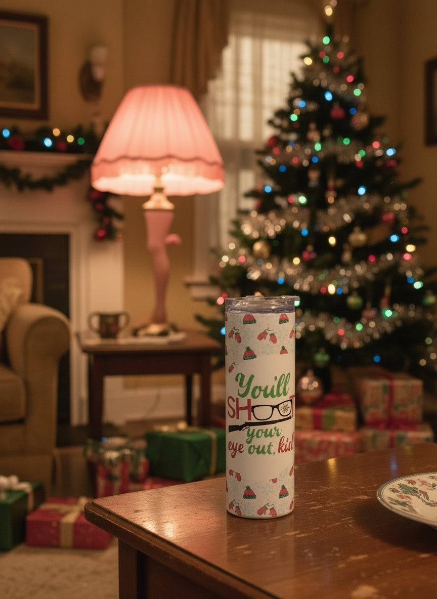 20 oz stainless steel, skinny, white tumbler featuring an A Christmas Story themed decal that has been heat pressed. Taking $10 off original price for an over lap of the print on the back of the tumbler. This tumbler comes with a clear lid and a stainless steel straw.