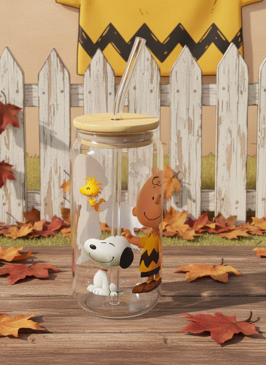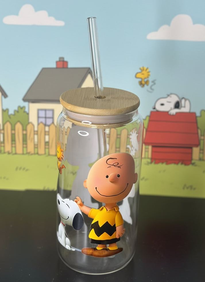 20 of, glass, traditional, non snow globe tumbler that features an animated image and comes with a bamboo lid and glass straw.